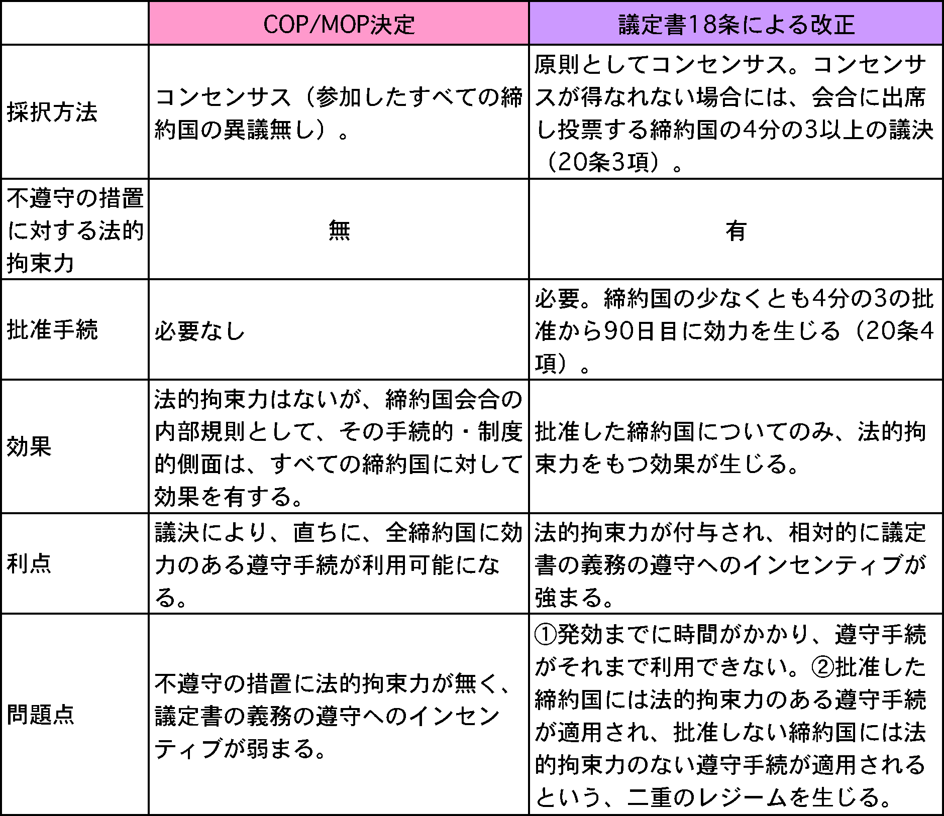 今回のCOP/MOP1では、不遵守国に課す措置に法的拘束力を与え